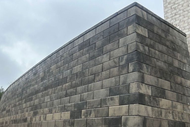 Allan Block Metropolitan is a smooth face retaining wall. It has a matching cap that overhangs the front of the wall slightly for a unique appearance.