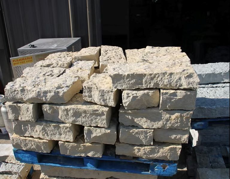 Colonial Buff Wallstone is a natural limestone light tan in color these stones are used in landscape projects such as small retaining walls, garden borders & walls around landsape beds. Size range is 6″ thickĀ  x 8″ depth x various lengths
