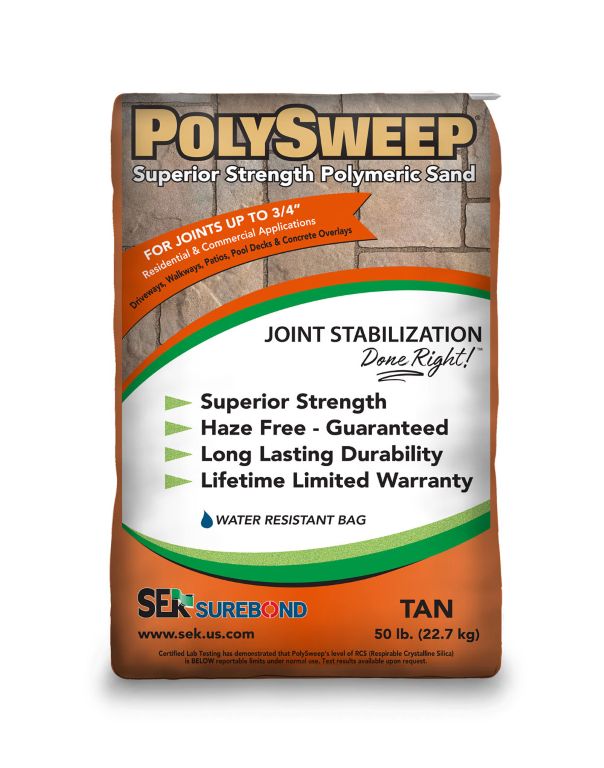 Polysweep Tan is a polymeric sand for between paver joints on patios, walkways & driveways. When the sand is wetted it then hardens between the joints to help with erosion, weeds & insects. Offered in a platinum color as well. Both are sold in 50 lb. bags.