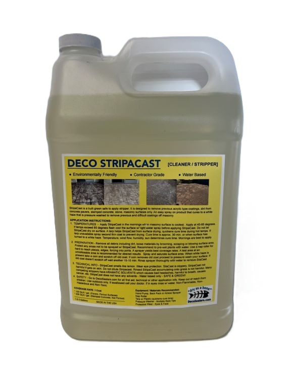 Stripacast is a liquid stripper that will remove old film forming sealers and coatings on concrete, pavers & other cement surfaces. Coverage per gallon is approximately 175-225 sqft. Sold in 1 gallon jugs or 5 gallon pails.